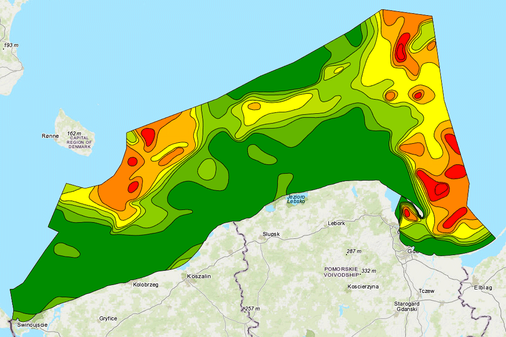 The map shows the percentage of fractions 0,5-1 mm at the bottom of the Baltic Sea. The map is part of the "Atlas of lithological parameters of the Baltic Sea sediments".